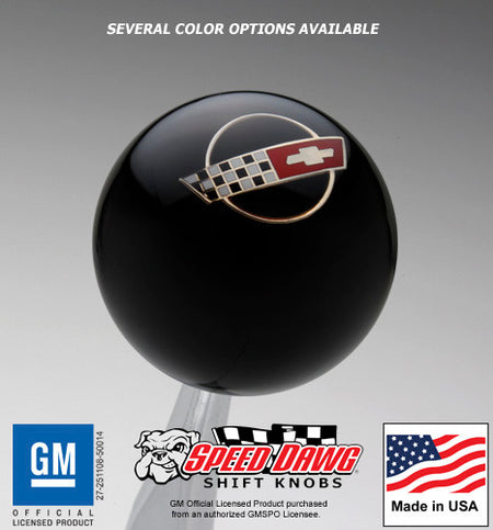 GM LICENSED SERIES. Premium quality 2" diameter Shift Knob with subsurface Chevrolet Corvette C4 emblem. GM Official Licensed Product. Comprised of specially formulated high-impact polymer resin specifically designed to meet performance level torque and temperature requirements. Glossy finish. This knob has 16mm x 1.50 solid brass threads and comes with a threaded brass adapter & jam nut in the size of your choice. May also be ordered with 9/16-18 threads either recessed or flush. Weight is 5 ounces. Made in the USA.