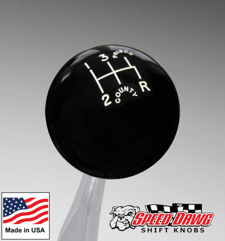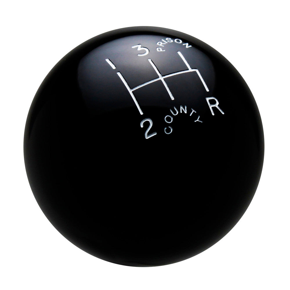 TRADITIONAL SERIES. Black 2-1/8" diameter shift knob with engraved White 5 Speed Reverse Lower Right shift pattern. COUNTY PRISON text replaces the 4 and 5 speed numerals. Comprised of specially formulated high-impact polymer resin specifically designed to meet performance level torque and temperature requirements. This knob has a 16mm x 1.50 Brass master insert and comes with a threaded Brass adapter & jam nut in the size of your choice. Made in the USA.