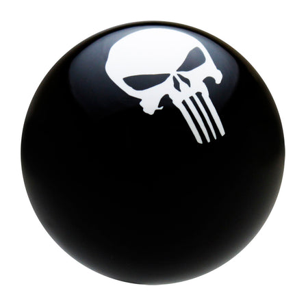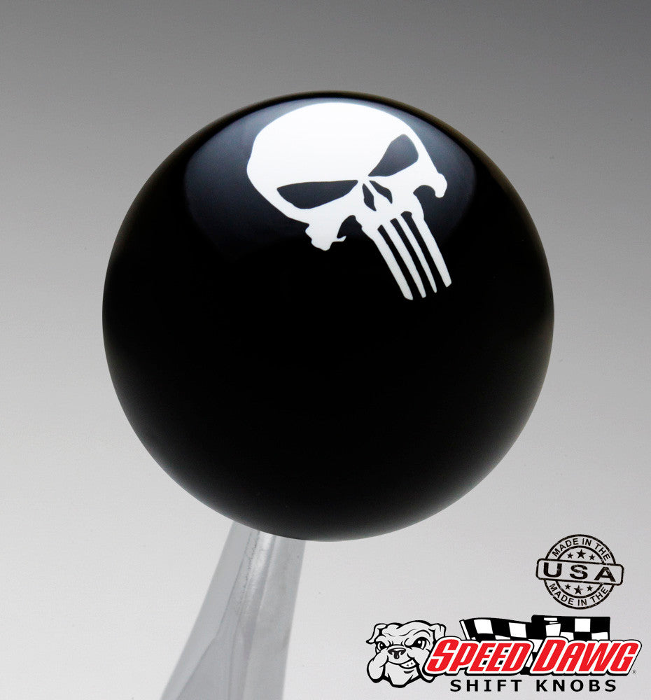 TRADITIONAL SERIES. Premium 2-1/8" diameter Black shift knob with smooth surface White Punisher style skull graphic on top. Skull graphic is inlaid for a smooth surface and will never wear off. Comprised of specially formulated high-impact polymer resin. This knob has a 16mm x 1.5 Brass master insert and comes with a threaded Brass adapter & jam nut in the size of your choice. Made in the USA.